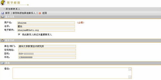 第二步:按照页面提示填写联系人信息。联系人信息包括:基本信息(用户名、名字、电子邮件),联系方式(单位/部门、住宅地址、座机、手机)以及其他备注信息。其中,用户名信息要求必须填写。 在“基本信息”区,如果您勾选了“将此联系人标记为重要联系人”前的复选框 ,则该联系人将被保存在重要联系人列表中。