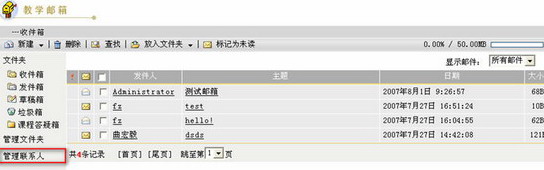 第一步:进入教学邮箱页面,点击页面左侧的“管理联系人”链接,进入管理联系人页面。