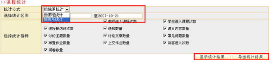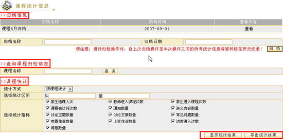 课程统计信息课程统计信息包括三个栏目:课程归档栏目、课程归档信息查询栏目和课程统计栏目。在归档栏目中,管理员可以将自上次归档日期到选定日期之间的课程统计信息归档,归档后的信息将不再出现在课程统计信息中,而是作为一个历史记录存档;在查询课程归档信息栏目中管理员可以查询某一课程的归档信息;管理员还可以查看教学平台内的课程统计信息并输出统计结果报表,课程统计信息的项目包括学生选课人次、教师进入课程次数、学生进入课程次数、课程被访问次数、通知数量、讲义内容数量、讨论主题数量、讨论文章数量、常见问题数量、布置作业数量、上交作业数量、访客进入次数和问卷数量等。具体操作如下: 图 1 课程统计信息页面添加归档信息管理员可以将自上次归档之后的统计信息进行再次归档,具体操作如下:在“归档信息”栏输入归档名称,选择归档日期,点击“归档”按钮,归档信息将出现在归档列表中。 图 2 添加归档页面查询课程归档信息在“查询课程归档信息”栏的文本框中输入课程名称,如“EDA技术与应用”,点击“查询”按钮将显示该课程在所有归档记录中的统计信息。 图 4 显示查询的归档信息 课程统计课程统计的方式有两种:按院系统计和按课程统计,这里以“按课程统计”为例,具体操作步骤如下: 请在“课程统计”栏选择统计方式和统计区间,勾选课程统计的统计指标项。 图 5 课程统计 点击“显示统计结果”按钮,进入课程信息统计结果显示页面,您可以很方便地查看所有课程的统计信息。页面上方列出了相应的栏目,点击该栏目,系统将列出依据该栏目“逆序”或“正序”排列的列表。 图 6 课程信息统计结果如果要导出统计结果,请在如图3-9-7所示的课程统计页面点击“导出统计结果”按钮,系统弹出提示窗口,选择“保存”按钮,可以将统计结果报表保存至本地机。 图7 提示窗口 |