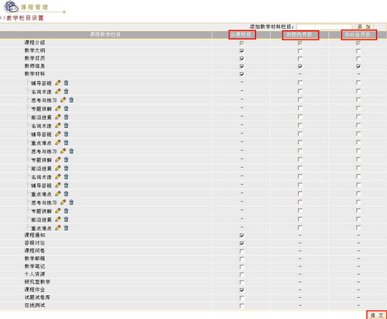 教学栏目设置用于对教学栏目进行管理,管理员可以添加、修改、删除教学材料下的子栏目,设置教学栏目是否为必要栏目,是否向社会开放。在操作区出现教学栏目设置页面,如下图所示: