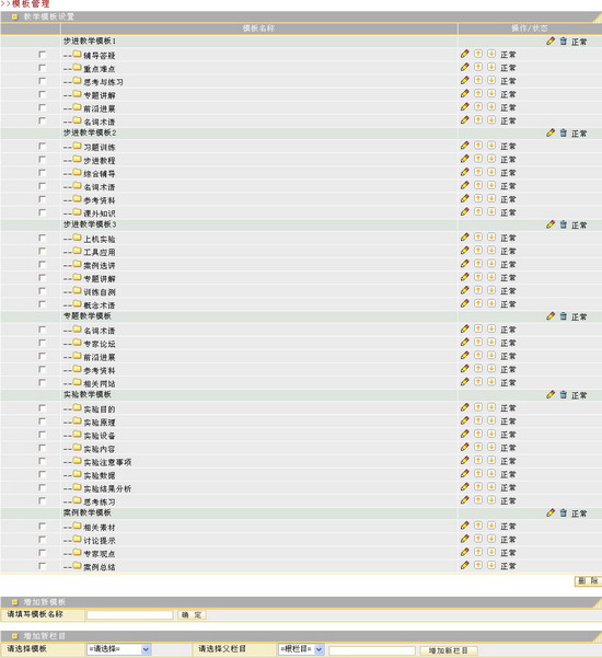 系统管理员设置的教学材料栏目模板,可以方便教师在教学材料栏目下批量地添加栏目树。管理员可以添加、修改、删除教学模板和模板下的栏目,设置模板和栏目的状态,并可以改变栏目的上下排列顺序。