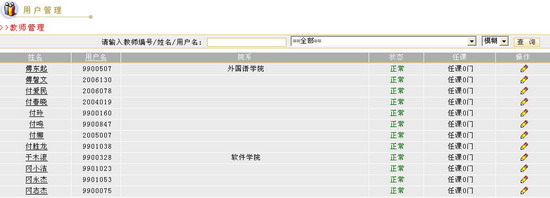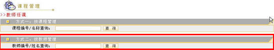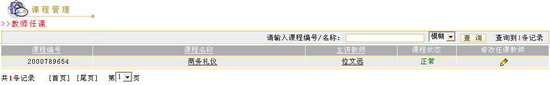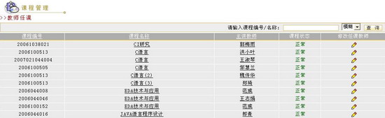 教师任课管理教师任课管理可以通过两种方式来进行,一种是按课程管理,一种是按教师管理。按课程管理就是首先给出课程列表,给某一门课程添加或删除该门课程的任课教师;按教师管理是首先给出教师列表,然后给某一教师选择任课课程 图 1 教师任课管理页面 按课程管理管理员可以通过“查询”方式来获得自己想要浏览的课程。查询方式有两种,一种是精确查询,一种是模糊查询。在教师任课页面的“课程编号/名称查询”输入框中填写课程编号或课程名称,然后点击“查询”按钮,进入教师任课页面,这时在教师任课页面会显示当前查找的课程。如果在查询输入框内不填写任何内容,直接点击“查询”按钮 图 2 教师任课信息 在教师任课页面,您还可以做进一步的查询。您可以在“请输入课程编号/名称”框内输入您所要查询的课程编号或课程名称信息,点击“查询”按钮 图 3 查询结果 该页面显示了课程编号、课程名称、主讲教师、课程状态、修改任课教师等操作选项。管理员可以在课程列表中点击课程名称来查看课程信息,点击主讲教师来查看主讲教师的情况。课程状态栏显示该课程的使用状态,“暂停”为暂停状态,“正常”为正常状态。学生无法看到处于暂停状态的课程。
