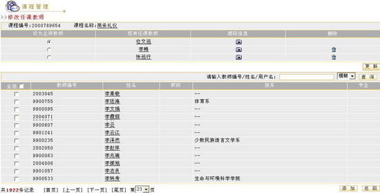 点击课程记录右侧的“修改任课教师” 图 4 设置任课教师管理员可以更改课程的主讲教师,添加或删除任课教师以及查看教师的跟踪信息,具体操作如下: 更改主讲教师 在任课教师列表中,选中“设为主讲教师”单选按钮