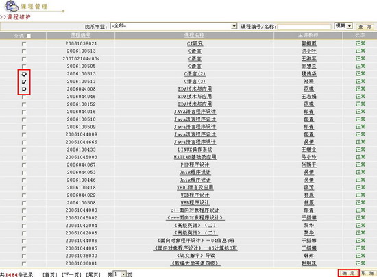图 5 任课教师课程教学记录 按教师管理在教师任课页面的“教师编号/姓名查询”输入框中填写教师编号或教师姓名,然后点击“查询”按钮,进入教师任课页面,这时,在教师任课页面会显示当前查找的教师用户。也可以直接点击“查询”按钮,进入教师任课页面,这时,在教师任课页面会显示所有教师用户的列表。 图 6 按教师管理 图 7 教师任课信息在教师用户列表的“任课”一列中给出了教师任课的课程总数,单击该总数右侧的“操作”图标 就会进入教师任课管理页面。例如,单击教师“顾江”所在行的“操作” 图 8 顾江教师的任课信息 在此页面可以为该教师添加或删除主讲课程和任课课程,还可以改变课程在列表中的排列顺序。具体操作如下: 添加主讲课程 点击“主讲的课程”列表下方的“添加主讲课程”按钮,出现所有课程列表页面,勾选所要添加课程前的复选框,点击列表下方的“确定 ”按钮即可。如果该教师已经为某门课程的主讲教师,则该课程前的复选框为灰色。 图 9 教师任课信息添加其它课程 点击教师任课管理页面“教授的其它课程”列表下方的“添加任课课程”按钮,出现所有课程列表页面,勾选所要添加课程前的复选框,点击列表下方“确定 ”按钮即可,操作同为教师添加主讲课程的过程。