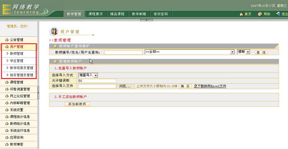 管理员可以批量添加教师用户,这样能够减少管理员的工作量。请进入教师管理页面: