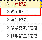 教师管理主要是添加、修改和删除教师用户,对用户在该平台上的状态进行设置,对密码进行修改等。 教师管理的操作如下: 点击左侧导航区的“用户管理”,弹出下级菜单显示用户管理类别。