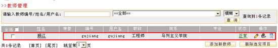 教师用户的查询有两种方式,一种是精确,一种是模糊。您在“教师编号/姓名/用户名查询”框内输入您所要查询的关键词,所输入的关键词可以是教师编号、教师姓名或教师用户名。系统会根据这个信息列出能匹配的教师用户。例如,查询姓名为“顾江”的教师用户,点击“查询”按钮后,将列出所有符合查询条件的教师用户。