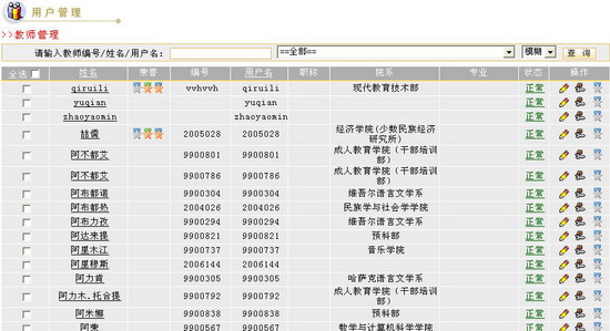 如果您在查询框内不输入任何查询信息,直接点击“查询”按钮 后,将会得到所有教师用户的列表。如果用户过多,您可以通过点击页面下方的“下一页”、“上一页”功能键或者直接“跳至第几页”来查看信息。