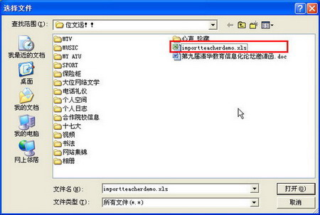 在“1.批量导入教师账户”中,点击 按钮,将批量导入用户的Excel文件保存至本地机打开批量导入用户的Excel文件,按照表头提示要求,填写用户相关信息并保存该文件。 再次进入教师管理页面,在“1.批量导入教师账户”的“选择导入文件”中点击按钮,在弹出的窗口中选择刚才保存的批量导入用户Excel文件,如下图所示: