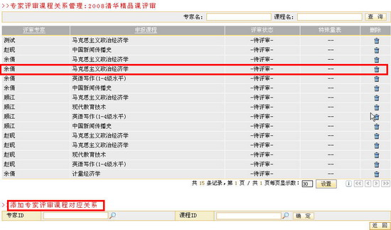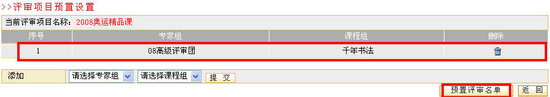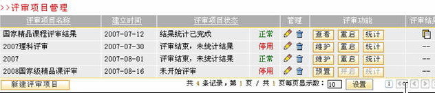 具体操作如下: 图 2 评审项目管理新建评审项目在评审项目管理页面,点击评审项目列表下方的 按钮,进入添加评审项目页面,在此页面设置相关选项并点击 按钮即可创建新的评审项目。 图 3 新建评审项目页面预置评审项目新建一个评审项目完毕后,点击 首先预置评审项目的内容,主要包括两部分,一是选择评审该项目的专家组,二是选择该评审项目所包含的课程组,选择完毕后点击 然后点击 图 4 评审项目预置 图 5 显示刚添加的专家组和课程组 图 6 管理评审名单开启评审项目点击 图 7 处于评审状态的评审项目结束评审项目在专家评审完精品课程之后,管理员可以点击该评审项目对应的 查看评审项目统计信息在结束该评审项目之后,点击 图 8 查看评审结果信息重起评审项目如果在一个评审项目结束后,如果发现某位专家还没有评审某一门精品课程,那么管理员可以点击 |