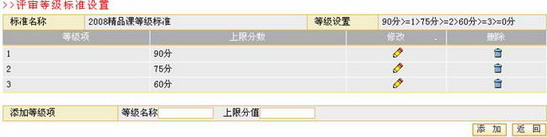 在页面下方的添加新评审等级标准一栏的文本框内输入新等级标准名称后点击按钮,进入评审等级标准设置页面后,设置相关的等级项并点击按钮即可。