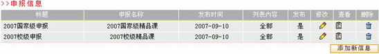 点击“主页管理”模块的“申报信息”栏目,在操作区显示申报信息页面。您可以进行申报信息的添加、修改和删除等操作。具体操作如下: