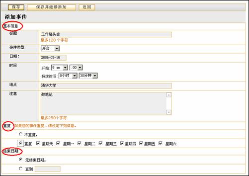 第二步:填写事件内容,包括:事件基本信息(标题、事件类型、日期、时间[开始时间和持续时间]、地点、备注);若是重复性事件,可以选择每周重复的时间,系统默认为不重复;结束日期。