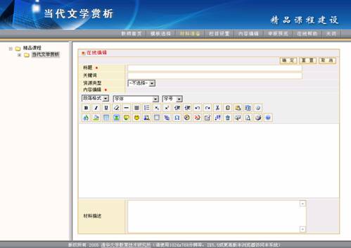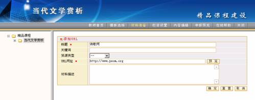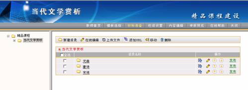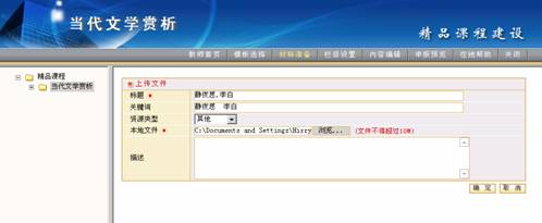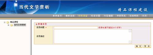 材料准备在“材料准备”功能模块,用户可以整理精品课程相关的材料文件,以便在设置引用类型为“精品课材料文件”与“精品课材料文件夹”的栏目的内容时,直接引用相关材料,从而避免资源的多次重复整理和建设。 进入“课程编辑”后,点击页面上方导航栏中的“材料准备”选项切换到“材料准备”页面后,便可以对精品课程材料进行维护,进行文件夹和文件的增加、删除、修改以及移动等操作,并可以查看各项资源的属性、设置其发布状态。如图1所示。 图 1 精品课程材料准备 新建目录选择图1页面上方功能菜单的“新建目录”选项进入“新建目录”页面后填写“目录标题”和“目录描述”信息并点击 图 2 新建目录 添加文件如图1页面上方的功能菜单所示,在精品课程建设系统中可以通过三种方式添加文件,分别是“在线编辑”、“上传文件”和“URL”。