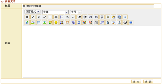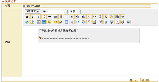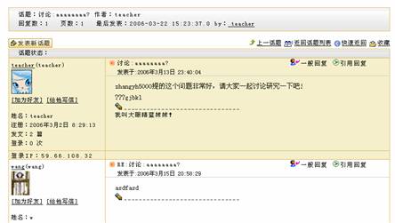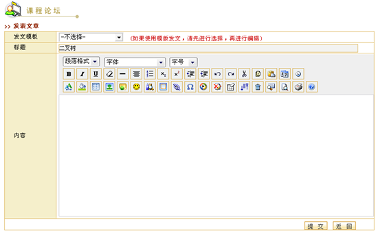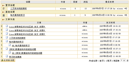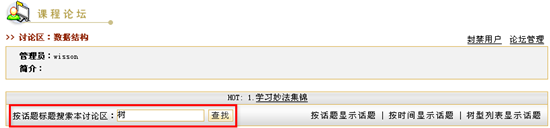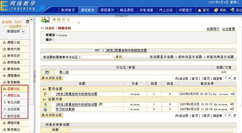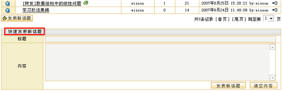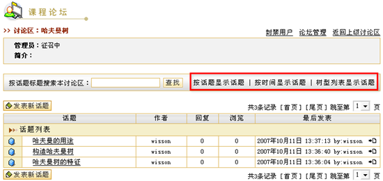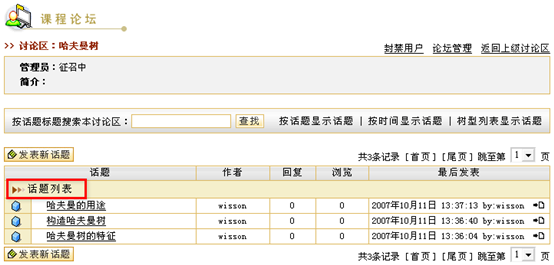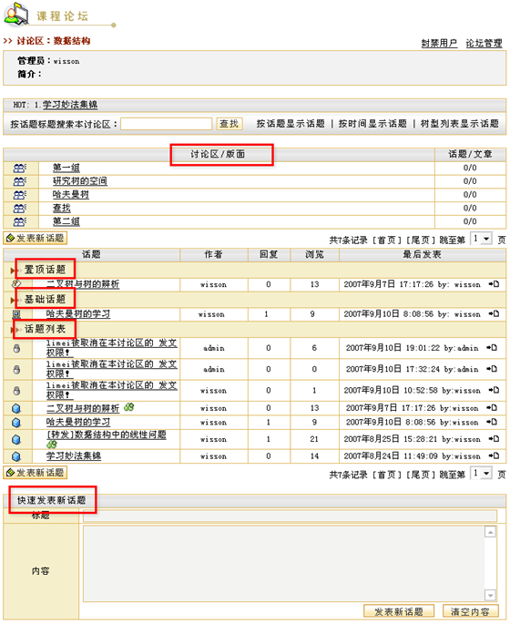 图 1 答疑讨论 课程论坛在新建课程时,系统会自动生成一个与课程绑定的专门的讨论区模块,我们称之为“课程论坛”。实际上,课程论坛也是网络教学平台的“网上论坛”的一个讨论区,而且会自动的归类于网上论坛的“课程讨论区”目录下,课程论坛的使用功能与网上论坛相同。例如,教师可以组织学生在“课程论坛”中自由讨论,教师可以发表讨论问题,也可以对学生的提问进行回答。教师可以作为课程论坛的管理员维护课程讨论区。 课程论坛的首页面包含该课程的讨论区列表、话题列表、置顶话题列表、快速发表新话题等,如图所示: 图 2 课程论坛首页