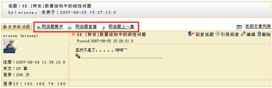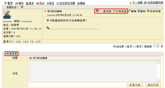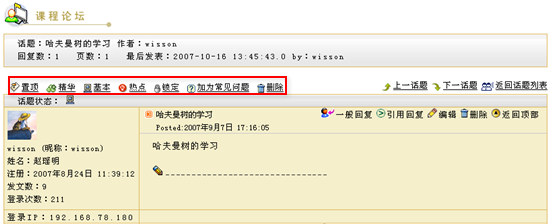 特别地,在课程讨论区内,教师除了可以锁定话题,将话题设定为置顶、基本、精华、热点等特殊状态之外,还可以将一个讨论成熟的问题整理添加到常见问题库中。 如下图所示,在课程论坛的一个话题浏览页面中,教师可以看到图中用红色标示的功能选单: