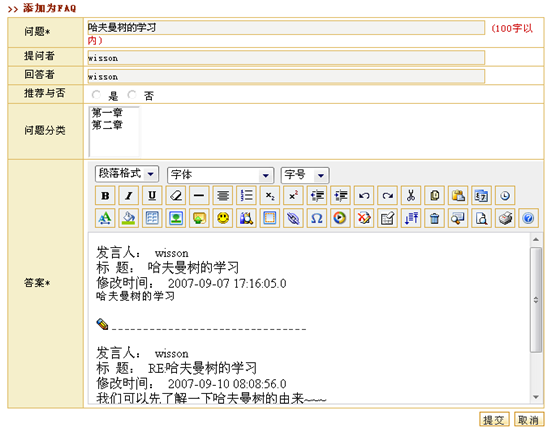 图 18 将课程论坛中的话题添加为常见问题 点击“加为常见问题”,显示问题整理页面,如图19所示。教师可以修改标题和正文,以及其他设定(提问者、回答者、推荐设置和选择问题分类)。注意,问题分类可以多选,按住shift键,用鼠标点击选择的多个分类。此外,系统会提供默认的提问者和回答者,并将全部讨论信息放到多媒体编辑器中,供教师修改。 编辑后点击提交,问题被保存到常见问题库。