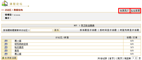 进入课程论坛,点击右上侧“论坛管理”(图1),进入讨论区管理页面(图2),点击“属性管理”,进入属性管理页面。