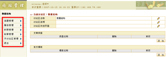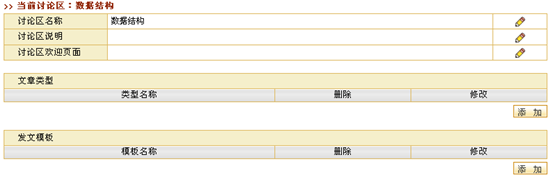 属性管理提供对讨论区基本属性的编辑、修改功能。基本属性包括:讨论区名称、讨论区说明、讨论区欢迎页面。在属性管理中还可设置讨论区文章类型和发文模版。具备当前讨论区管理权限的用户可设定讨论区基本属性。属性管理界面如下图所示: