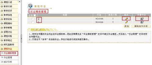 作业模版管理向学生布置的作业均出自作业模板库,因此您需要先在“作业模板管理”栏目中建立作业模板,之后才能向学生布置作业。所建立的作业模板是可以重复使用多次的。 点击左侧菜单中的“课程作业”栏目,弹出二级菜单。学生点击二级菜单中的“作业模板管理”栏目,进入作业模板管理区。页面上列出作业模板的选择框,标题,作者,使用次数信息,具有查看,修改,添加,删除作业模板,设置标准答案,布置作业的功能。 图 1 作业模板管理 添加作业模版