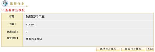 在作业管理页面单击已添加完成的模板名称,可查看该作业模板的标题,作者,使用次数,作业内容;可以单击下面的“修改作业模板”“删除作业模板”对该作业模板执行修改、删除操作,操作方式与在模板管理页面方式相同;单击“返回”按钮返回到作业模板管理页面。 图 7 查看作业模板 布置作业