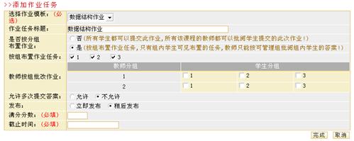 同一个作业模板可以重复多次执行布置作业操作,也就是一个模板可以重复使用。 在作业模板管理页面上单击要使用作业模板后的“布置作业”按钮 图 8 布置作业 请您按照页面提示选择作业模板,设置作业任务标题,选择是否按分组布置作业,是否允许多次提交答案,是否要立即发布,满分分数,截止时间。其中作业模板,满分分数,截止时间是必填项。 选择作业模板栏默认是您单击“布置作业”时所选的模板,可以单击下拉菜单根据您的需要更改。 是否按分组布置作业,选择“否”,你布置的作业下发给所有选课学生,所有学生都可以提交此作业,所有该课程的教师都可以批阅学生提交的此次作业;选择“是”,需要在“按组布置作业任务”中根据组名称选择您要布置作业的学生组和批阅作业的教师组,布置之后只有组内学生可见布置的作业,教师只能按可管理组批阅学生的答案。 允许多次提交答案,选择“允许”则学生可以多次提交答案,否则只能提交一次。 发布选择立即发布,则学生立即能看到布置的作业,选择“稍后发布”,该作业在作业管理页面的状态为“未发布”,需要教师在作业管理中将该作业的状态改为“发布”,学生才能看到此作业。 输入的满分分数在教师批阅作业时提示教师所给的分数不能超过满分。 在“截止日期”一栏内单击就会出现时间日历,教师可以选择一个提交作业的截止日期。
