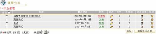 作业管理作业管理中可以对所有作业进行管理。点击左侧菜单中的“课程作业”栏目,弹出二级菜单。学生点击二级菜单中的“作业管理”栏目,进入作业管理区,列出所有作业信息列表,信息包括:作业标题,截止日期,状态,作业提交数,未批阅作业数,可执行添加作业,修改作业,查看作业信息,改变作业状态,统计作业信息,批阅作业,删除作业操作。 图 1 作业管理 添加作业