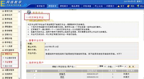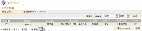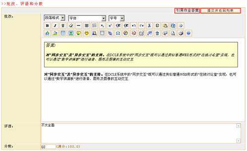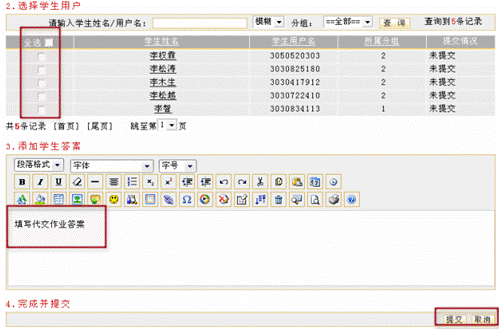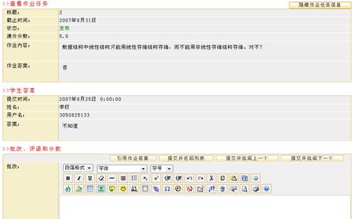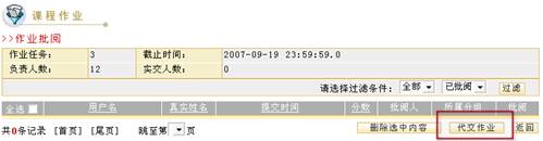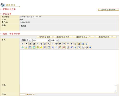 教师在批阅作业空间可以对学生提交的作业进行批阅打分或删除。 单击作业管理页面的“批阅作业” 图 6 批阅作业 选择过滤条件 可根据学生分组和是否批阅两种情况过滤所显示的提交作业列表。 根据页面提示选择条件后,单击“过滤” 查看学生基本信息 单击用户名,真实姓名可查看学生基本信息,如下图所示: 图 7 学生基本信息 代交作业 平台为教师提供了“代交作业”的功能,教师可以代替学生完成作业提交工作。在要批阅的作业后单击“批阅” 图 8 作业批阅 图 9 代交作业 进入作业代交页面后,页面上显示了本次代交作业任务。教师选择相应的代交作业的学生,将其姓名前的复选框 图 10 填写代交答案 批阅作业 在要批阅的作业后单击“批阅” 如果页面内容较多,可单击“隐藏作业任务信息”按钮将作业信息隐藏起来。 图 11 批阅页面1 图 12 批阅页面2 批改作业 系统默认将学生答案显示在批改框中,教师可对答案的每一部分进行批改,也可以单击页面上发的引用作业答案整体引用学生答案,如下图所示: 图 13 批阅页面3 评语中可以输入教师对该作业的评语,分数框中教师可以给学生打分,所打的分数不能超过布置作业时所设置的满分,并且会在统计信息中被统计。 批阅完毕后单击“提交并返回列表” 删除 在批阅作业页面可以删除不需要的信息,例如已批阅的作业信息就可以被删除。单击要删除作业前的选择框选择要删除的作业,再单击“删除选中内容”按钮 图 14 删除作业