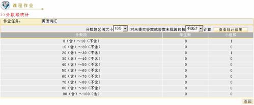 单击作业管理页面的“统计信息” 图 5 作业信息统计 根据页面提示选择统计条件后单击“查看统计结果”,根据教师选择的分数段区间,未提交答案或未批阅作业的处理方式统计出该门课程各分数区间内的学生数和学生小组数。 默认显示的是根据分数段区间为10分,对未提交答案或答案未批阅的按不统计计算的统计结果。 批阅作业