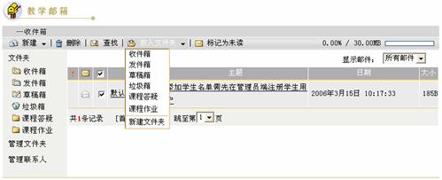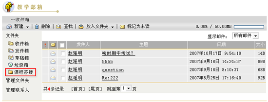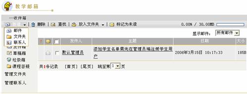 第一步:进入教学邮箱页面,点击文件夹列表中的“收件箱”,进入收件箱邮件列表页面,如下图所示: