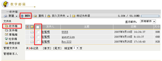 在教学邮箱栏目中,用户可以删除邮件、文件夹和联系人。