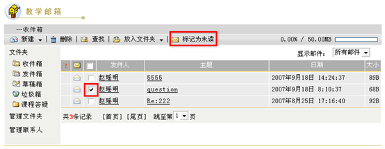 在教学邮箱的邮件列表中,勾选需要标记为“未读”的邮件所对应的复选框 ,点击页面上方的“标记为未读”按钮,则相应的邮件将被重新标记为未读邮件。
