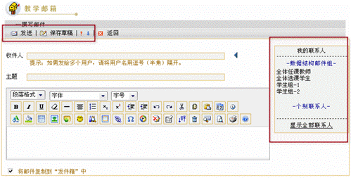 教学邮箱为用户提供了新建联系人的功能。如果您在教学邮箱中建立了联系人,那么在新建邮件时,您将不用填写收件人的用户名,只要直接点击联系人列表中的联系人姓名,相应联系人的用户名就会出现在收件人输入框中。