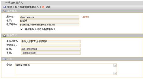 第二步:按照页面提示填写联系人信息。联系人信息包括:基本信息(用户名、名字、电子邮件),联系方式(单位/部门、住宅地址、座机、手机)以及其他备注信息。其中,用户名信息要求必须填写。