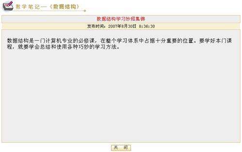 进入“我的笔记本”页面,在“标题”栏目下列出了教师本人记录的笔记的标题,点击相应的标题,就会弹出内容对话框。教师可以浏览相应的教学笔记的内容。如图示: 图 5 浏览教学笔记 笔记时间