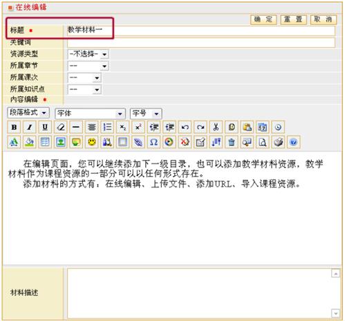 第二步:输入材料内容和其属性,其中,“标题”不能为空,选择所属资源类型、章节、课次及知识点,材料的内容可以通过在线编辑器输入。点击“确定”完成添加,并返回教学材料列表;点击“重置”清空页面内容;点击“取消”,则取消添加,返回上一级页面。