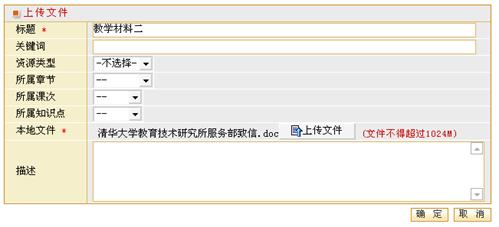 第二步:输入教学材料标题及其它属性,其中,“标题”不能为空,选择所属资源类型、章节、课次、知识点,上传的文件不能超过10M。点击“确定”完成添加,并返回教学材料列表;点击“重置”清空页面内容;点击“取消”,则取消添加,返回上一级页面。