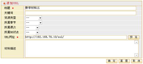第二步:输入标题及其它属性,其中,讲义“标题”不能为空。点击“确定”完成添加,并返回教学材料列表;点击“重置”清空页面内容;点击“取消”,则取消添加,返回上一级页面。