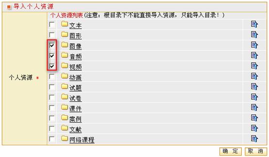 可以将“个人资源”栏目中的素材引用到您的教学材料中。若选择的是“个人资源”中的目录,则选择的内容会以目录的形式存放到您的教学材料目录中;若选择的是“个人资源”中的资源,则选择的内容会以资源的形式存放到您的教学材料资源列表中。