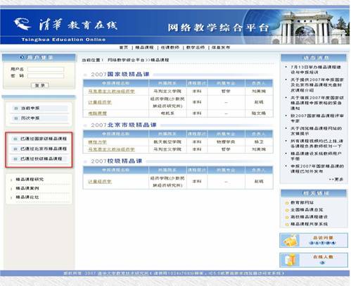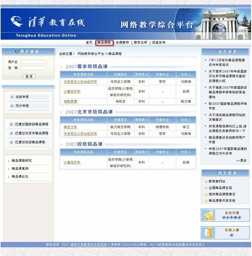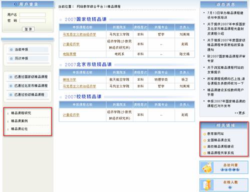 精品课程首页主要包括动态消息区、申报信息区、校内评审结果信息区和其他栏目及链接(如图1)。在动态消息区您可以浏览公告,最新的公告信息总是显示在最前面。在评审通过精品课信息区,您可以浏览国家级、省市级、校级已经通过评审的精品课程列表。在申报信息区,您可以看到由管理员发布的申报课程。在校内评审结果信息区,您可以看到由管理员发布的课程评审结果信息。其他栏目及链接为用户提供了可以访问的其他网络资源。