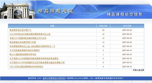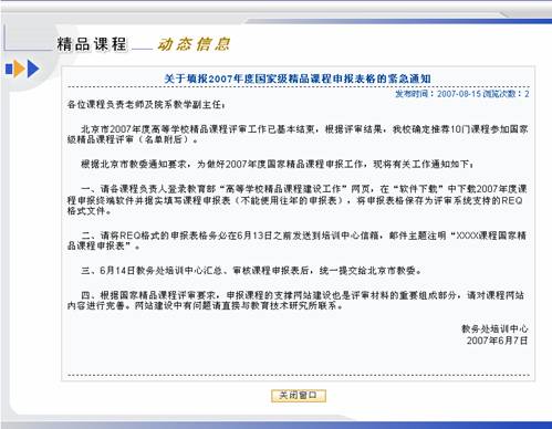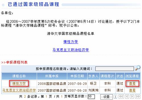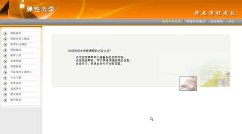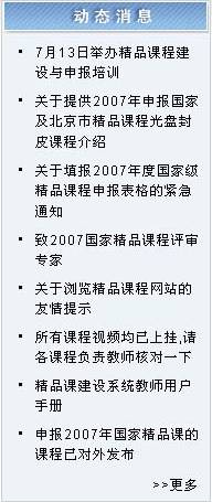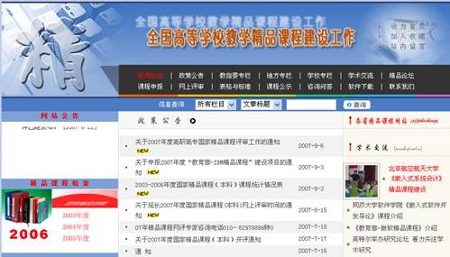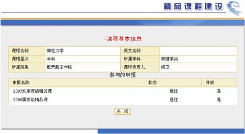 图 1 精品课程 动态消息动态信息是由管理员发布的相关公告,最新发布的公告信息显示在列表的最上面。 图 2 动态信息 点击“动态信息”区中任何一条通知公告的标题,则弹出该条通知公告的内容页面。 图 3 浏览动态信息 如果想查看更多的公告信息,请点击“动态信息”区下方的“更多”按钮,在弹出窗口中显示通知公告列表。 图 4 更多通知公告 系统访问系统访问计数器记录用户浏览本系统的次数,用户每访问一次精品课程系统首页,计数器自动加一。 “系统访问计数器”显示了本系统被各类用户访问的次数总和。 图 5 系统访问计数器 评审通过课程展示区评审通过精品课信息列出已经通过评审的精品课程,即状态为“通过”的课程。该信息分为:国家级精品课、省市级精品课和校级精品课。 图 6 评审通过的精品课信息区 在“评审通过的精品课信息”区,点击“国家级精品课程”超链接,在操作区显示通过国家级精品课评审的课程列表(如图7)。 图 7 已通过评审的国家级精品课程列表 点击课程列表中的课程名称,可以查看课程基本信息,点击课程所在行的“查看” 热键,可以浏览该课程。如,点击“弹性力学”,界面如图8,点击“弹性力学”所在行的“查看”,界面如图9。 图 8 课程基本信息 图 9 浏览课程 申报信息区申报信息是所有精品课程申报的课程列表。包括“当前申报”和“历次申报”两个栏目。 在首页面上点击“当前申报”,操作区显示当前申报课程列表(如图10)。 图 10 当前申报信息列表 点击课程名称即可浏览该课程。 同样,在历次申报页面显示往次申报的精品课程列表。 其他栏目及链接精品课程网上建设与评审子系统(简称精品课程系统)通过精品课程研究、精品课案例等栏目及相关网站链接提供精品课建设的相关材料和信息。 图 11 其他栏目及链接 例如点击“全国精品课总览”链接,可链接到全国精品课门户网站(如图12)。 图 12 全国高校精品课信息网 |