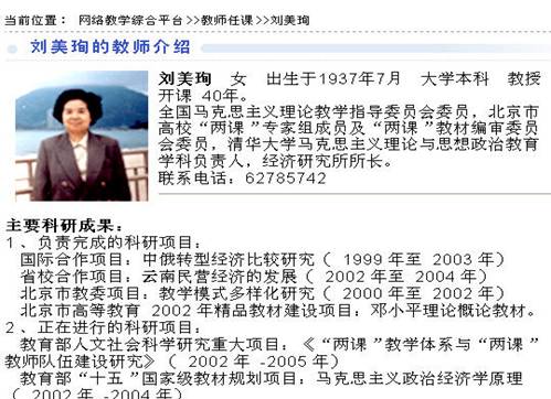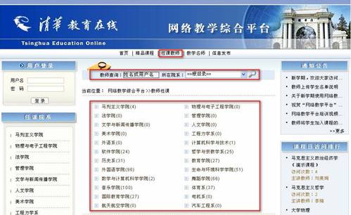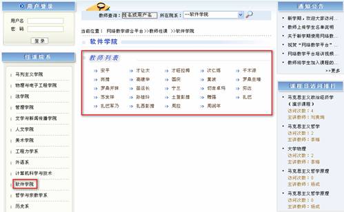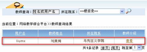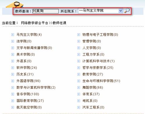 任课教师概述任课教师栏目为学生提供了所有任课教师的个人信息。学生既可以按照院系来查看任课教师信息,也可以输入要查找的教师用户名来精确查询该教师(如图1)。 图 1 任课教师页面 按院系查找任课教师按院系查找任课教师只需在左侧的任课院系列表中选择某一院系,操作区显示该院系的所有教师列表。如,要查询“软件学院”的所有任课教师情况,您可以点击左侧任课院系栏目下的“软件学院”来查看该学院的所有任课教师。 图 2 按院系查找任课教师 点击任课教师的姓名,既可浏览该教师的个人信息。 图 3 浏览任课教师信息 按姓名精确查找任课教师在页面上方的教师查询输入框中输入要查找的任课教师的姓名并选择所在院系,可精确查询该任课教师,如,查找马列主义学院的刘美珣老师(如图4),点击搜索图标 图 4 按姓名、院系精确查询任课教师 图 5 精确查询的结果 |