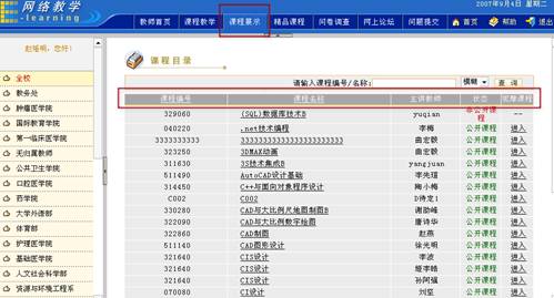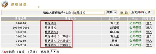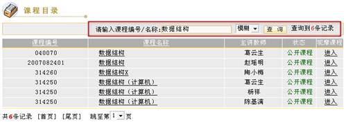 课程展示概述课程展示显示了网络教学平台所有注册课程的列表。列表内容包括课程编号、课程名称、课程主讲教师和课程状态以及课程观摩。 教师登录系统后,点击页面上方的“课程展示”导航栏,进入课程展示页面,如下图所示: 图 1 课程展示 在课程展示页面的下方显示了系统注册课程记录的总数,以及首页、尾页和页面跳转热键。点击跳转页的下拉框选择跳转页数可以直接跳转到所选页。 点击课程列表标题栏中的“课程编号”或“课程名称”热键,课程列表将按课程编号或课程名称进行排序。 课程查询课程展示页面为教师提供了查询系统注册课程的功能。 操作步骤: 第一步:进入课程展示页面,左侧列表列出了所有开课的院系名称,点击相关的院系,页面会显示该院系所属的全部课程列表。例如,选择“大学外语部”,则页面会显示该院系所属的全部课程列表。如下图所示: 图 2 课程查询—按院系查询 第二步:在页面上方的“请输入课程编号/名称”文本框中填写所要查询课程的关键词,关键词可以是课程编号或课程名称。然后,选择查询模式,是“精确”查询,还是“模糊”查询。最后,点击“查询”按钮 图 3 课程查询—关键词查询 ·“精确”查询与“模糊”查询的区别在于多个词条组合查询时,“精确”查询表示词条组合关系为“与”;而“模糊”查询表示词条组合关系为“或”。词条间用半角空格分隔。 浏览课程介绍课程展示页面为教师提供了浏览课程介绍的功能。 进入课程展示页面,在“课程名称”一列中,点击需要浏览的课程名称,在新弹出窗口中显示相应课程的课程介绍内容。 图 4 课程名称