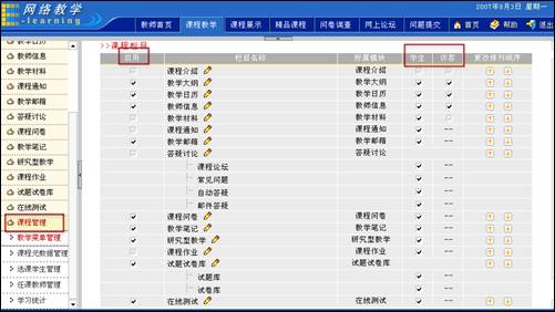教学菜单管理网络教学平台为课程任课教师提供了设置选课学生课程学习权限与访客浏览公开课程权限的功能。也就是说,选课学生登录系统并进入某课程的课程教学空间后,所能够看到并使用的课程教学栏目是由该课程的任课教师来设定的。 进入课程教学空间,点击左侧栏目“课程管理”的二级栏目“教学菜单管理”,进入教学菜单管理页面,如下图所示: 图 1 教学菜单管理 在教学菜单管理页面中,课程任课教师可以对选课学生的以下学习权限进行设置:浏览课程介绍、浏览教学大纲、浏览教学日历、查看教师信息、浏览教学材料、浏览课程通知、答疑讨论(课程讨论区、常见问题、自动答疑、邮件答疑)、课程作业、学习笔记、课程问卷、教学邮箱、在线测试、试题试卷库等,以及可以设置某些栏目是否启用、访客是否有权限访问某些栏目(教学大纲、教学日历、教师信息)。 具体操作方法: 第一步:勾选“启用”栏目下相应模块前的复选框 第二步:勾选需要为选课学生开放的功能模块前的复选框 第三步:勾选需要为访客开放的功能模块前的复选框 第四步:选择完毕,点击页面下方的“确定”按钮 另外,教师可以根据个人需要对教学栏目的名称进行修改。点击栏目名称后面的按钮 ·如果您不是课程的主讲教师,并且主讲教师也没有为您分配进行课程学习设置的权限,则您进入课程教学空间后,在左侧栏目中将无法看到“教学菜单管理”栏目。 |