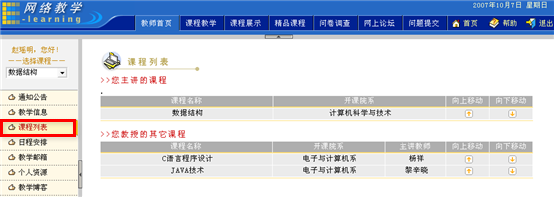 进入教师首页,点击左侧菜单中的“课程列表”栏目,进入课程列表页面,列出所有课程名称,开课院系。主要功能包括:选择课程,排列课程顺序,删除课程。