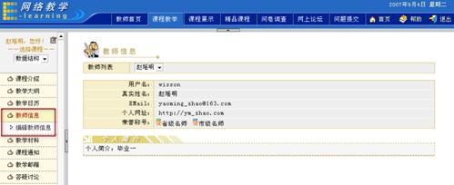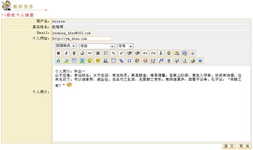 图 4-6-1 浏览教师简介信息 点击二级栏目“编辑教师信息”,进入编辑教师信息页面,对教师本人的简介信息进行编辑,如下图所示: