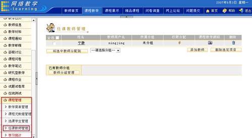任课教师管理任课教师管理是课程主讲教师对本门课程任课教师进行管理的空间,包括添加、删除任课教师,给任课教师分配权限、查看任课教师的课程教学记录和添加、修改、删除任课教师分组,给分组分配任课教师,从分组中删除任课教师等功能。 进入课程教学空间,点击左侧栏目“任课教师管理”,进入任课教师管理页面。 图 1 任课教师管理