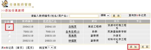 进入任课教师管理页面,点击页面下方的“添加教师”按钮 教师可以通过查询功能来查找需要添加的教师用户。 图 2 添加任课教师