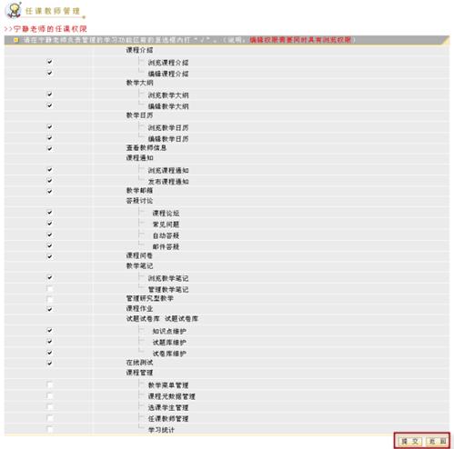 课程主讲教师可以通过 “权限分配”功能为其他的任课教师设定教学模块的使用权限。 第一步:进入任课教师管理页面,点击“权限分配”图标 图 4 权限分配 第二步:在权限设置页面中,勾选需要为该任课教师开放的功能模块前的复选框 图 5 任课教师权限设置