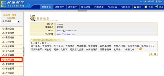 进入教师首页,点击左侧菜单中的“教师信息”栏目,进入教师信息页面。